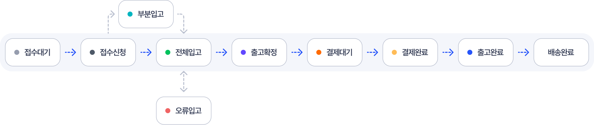 신청서에 작성된 상품 중 일부만 도착한 상태입니다. 상품이 한 개일 경우 부분입고 단계가 생략되어 전체입고 상태로 변경됩니다.
